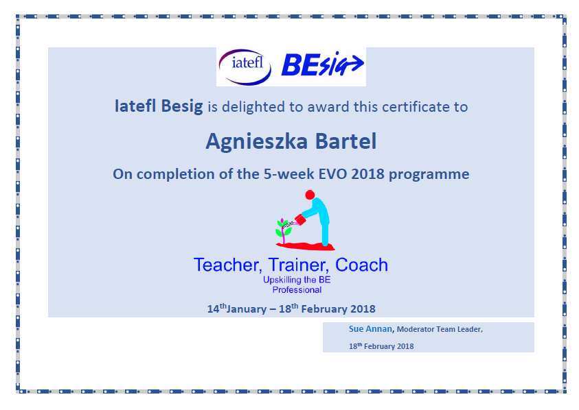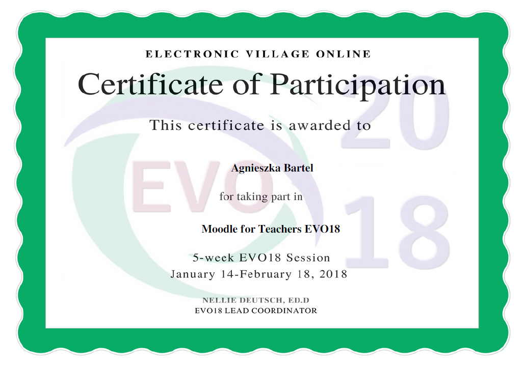 - Certyfikat uczestnictwa w jednej z 5-tygodniowych sesji EVO2018